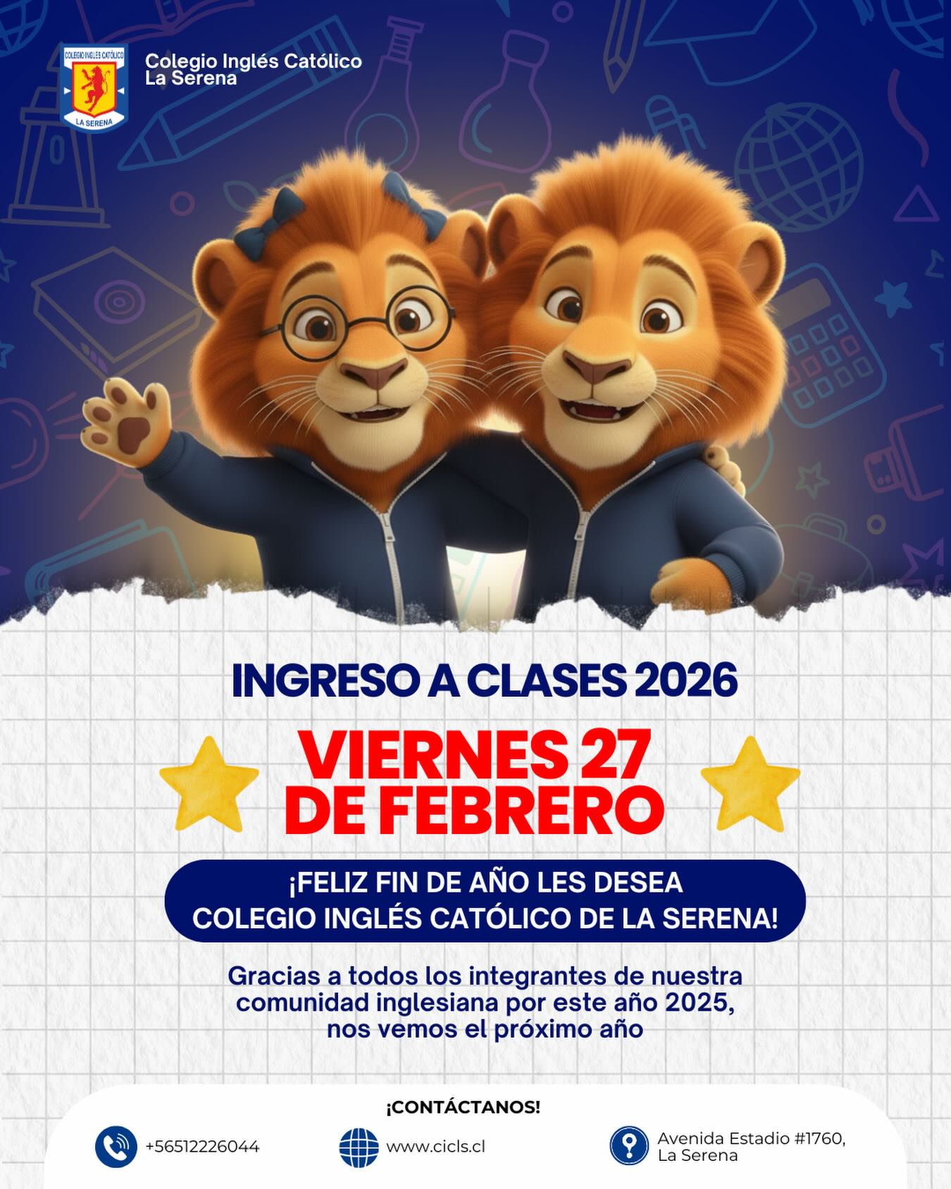Junto con saludar, informamos que durante los meses de enero y febrero, el Colegio Inglés Católico de La Serena mantendrá una modalidad de atención reducida, debido al período de receso escolar y al feriado legal del personal.